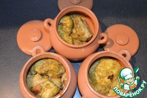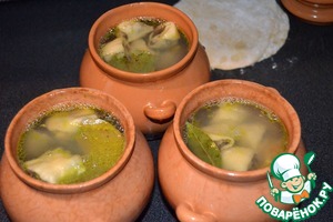 Укладываем в горшочки и все заливаем горячей водой. Сверху горшочки закрываем крышечками из теста.