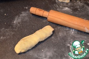 Достаем тесто и раскатываем в колбаску, которую режем на 6 частей.