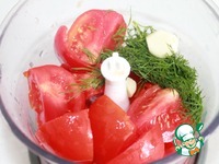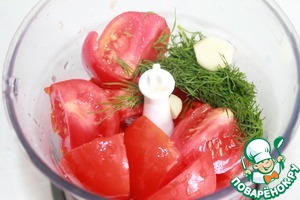 Перец и помидоры нарезаем кусочками, складываем в блендер. Туда же чеснок и зелень. Измельчаем. |