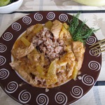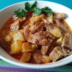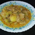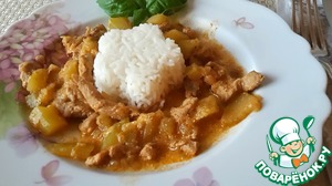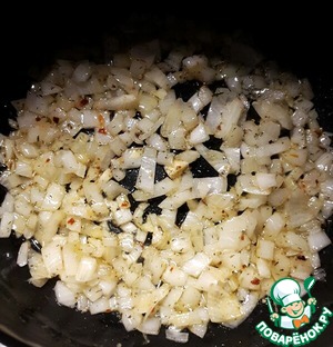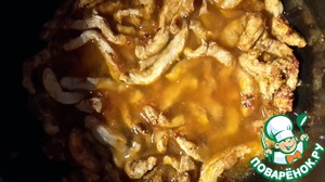 В 2х столовых ложках растительного масла обжариваем нарезанный мелкими кубиками репчатый лук, через 5 минут добавляем специи и нарезанное длинными кусочками мясо. Обжариваем, время от времени помешивая. -