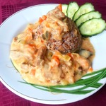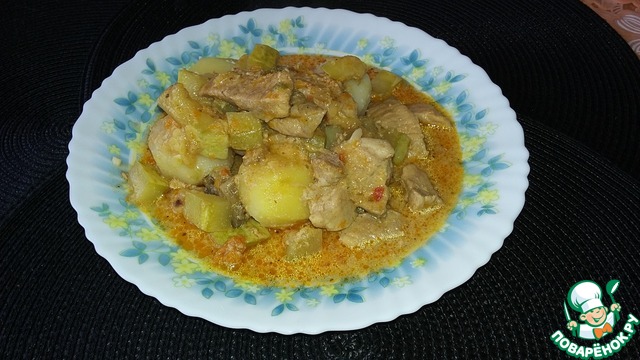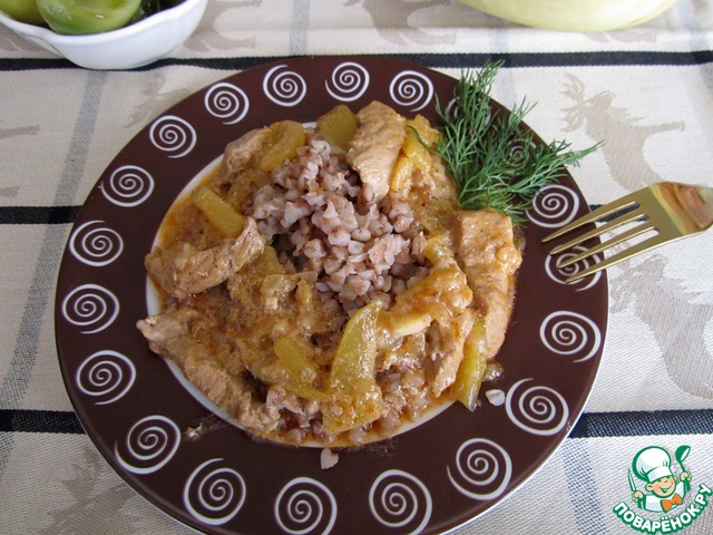 Случалось ли вам, поварята, сталкиваться с ситуацией, когда мясо с тарелки улетучивается в мгновение ока, а овощи как лежали, так и лежат? В таком варианте с тарелки исчезает все! Долго раздумывала, имеет ли смысл размещать этот рецепт. В моей семье он пользуется неизменной популярностью, надеюсь, пригодится кому-нибудь еще. Рецепт прост до безобразия, блюдо готовится почти без вашего участия, самое сложное - нарезать мясо, лук и кабачок.