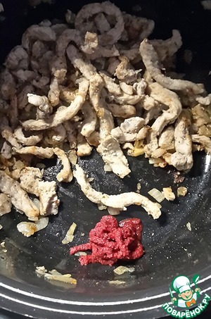 За 2 минуты до окончания программы добавляем столовую ложку томатной пасты. К тому времени мясо должно аппетитно зазолотиться. Все тщательно перемешиваем.