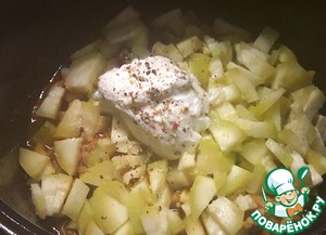 Через 30 минут добавляем кабачок, нарезанный небольшими кусочками. Солим по вкусу.