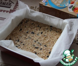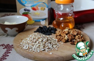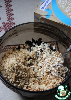 Для злаковых коржей смешать хлопья, мелко рубленые орехи, изюм, соль, цельнозерновую муку, растопленное сливочное масло, мед и 1 взбитое яйцо.