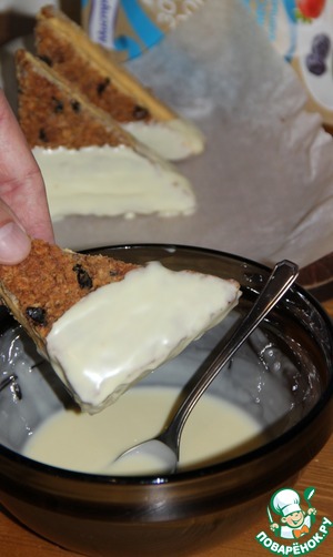 Подмороженные сэндвичи окунуть одним уголком в глазурь и выложить на пергамент. Убрать в холод на 10 минут.