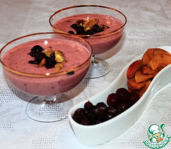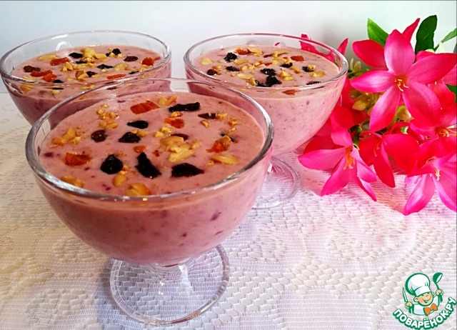Разливаем смузи по стаканам, украшаем рублеными орешками, сухофруктами.