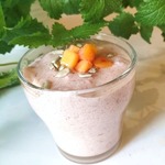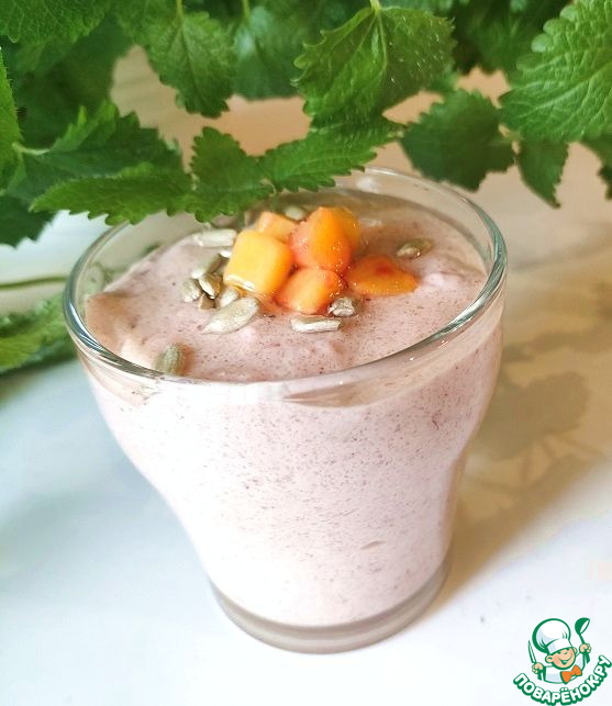 Добавляю йогурт, снова включаю блендер до перемешивания ингредиентов. Разливаю смузи в стаканы или баночки, украшаю листиками свежей мяты. Приятного Вам аппетита!
