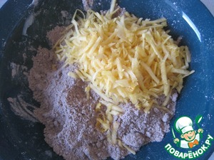 Добавляем сахар, разрыхлитель, протертое через терку холодное масло и растираем руками. Получается рассыпчатое крошковатое тесто.
