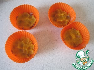 В силиконовую форму на дно выкладываем тесто тонким слоем, затем слой тыквы ( натираем на мелкой терке и ставим в микроволновку на 2 мин)