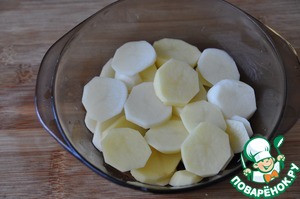 Картофель моем, чистим, режем тонкими кружками, кладём в посуду для СВЧ печи, накрываем крышкой и ставим в микроволновую печь на 4 минуты на полную мощность (у меня 800 Вт).