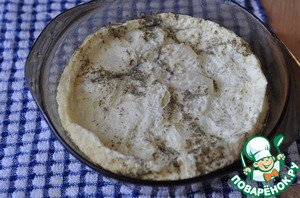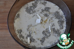 Берём сливки, яйца, натираем сыр, кладём соль, сухой укроп и базилик.