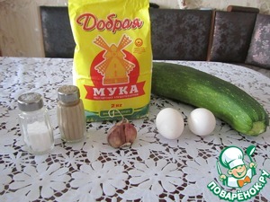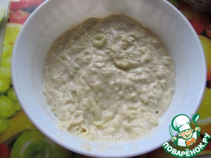 К отжатому кабачку добавляем два яйца, муку, потертый на мелкой терке чеснок, соль, перец и перемешиваем. По консистенции тесто должно получится как не очень густая сметана. Чеснока и перчика я добавляю побольше, так как люблю когда оладушки остренькие.