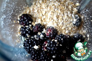 В чашу блендера кладем хлопья, йогурт и ежевику. Взбиваем