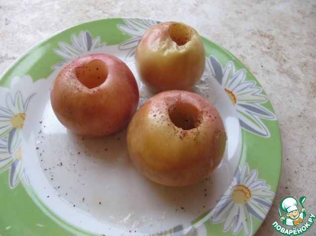 Сезонные яблоки среднего размера запечь в микроволновке или духовке, предварительно вынув сердцевину и посыпав корицей.