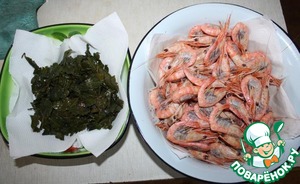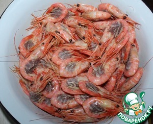 Креветки подготовить. Если креветки сырые, удалить кишку и сварить до светло-красного цвета, если варено-мороженые, разморозить
