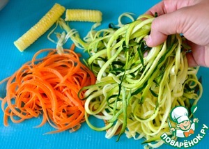 Подготовить первым делом овощи. Морковь очистить, вымыть, высушить и нарезать нитями (получается почти как нарезка жульен, только еще длинее). Цуккини также вымыть, но не снимать кожуру. Обрезать края и также натереть его нитями...