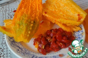 • Разрезать момордику пополам и очистить от семян. ВНИМАНИЕ! У меня момордика не горькая, если у вас сорт который горчит, то её надо вымочить в подсоленной воде не менее 2-х часов. Меняя воду 2-3 раза.