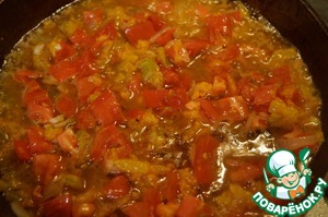 • Затем добавить нарезанные кубиками помидоры, соевый соус, уксус, измельченный чеснок и душистый перец. Протушить еще 5 минут.