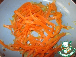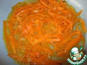 Лук мелко порезать, морковь очистить, разрезать вдоль пополам, и настрогать по узкой части картофелечисткой на ленты. Я ещё и каждую ленту резала вдоль пополам, потому что люблю, когда в блюдах ингредиенты порезаны мелко. Обжарить лук и морковь на растительном масле до прозрачности лука.