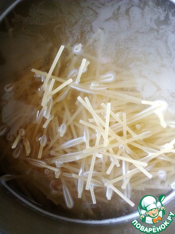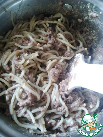 В кипящую подсоленную воду бросаем спагетти. Варим до готовности. Не забываем мешать. Готовые спагетти промыть водой. Отбросить обратно в кастрюлю и выпарить воду.