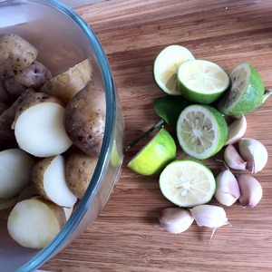 С готового картофеля слить воду. Головку чеснока разобрать на зубки. Лимоны разрезать пополам. В этот раз у меня зелёные лимоны из Абхазии. Нужно отметить, что они гораздо более ароматные, но и более кислые. Кроме того, косточки я оставила только для фото, их, конечно, необходимо вынуть. Иначе, не избежать неприятной горечи.