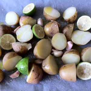 Выложить на противень, застеленный пергаментом, картофель, чеснок и лимоны. Посолить и сбрызнуть оливковым маслом. Запечь при 200 градусах до корочки. В процессе запекания несколько раз перемешать. У меня ушло 45 минут.