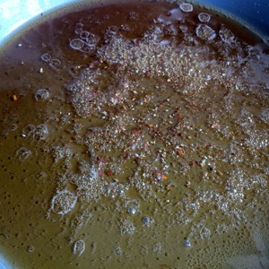Через несколько минут смесь потемнеет и станет гуще. Это произойдет минут через пять. Конечно, время зависит от степени нагрева и толщины дна сотейника. В карамель всыпать хлопья чили.