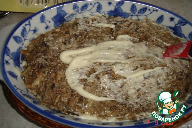 Выдавить через пресс чеснок и равномерно распределить на слой из яиц.