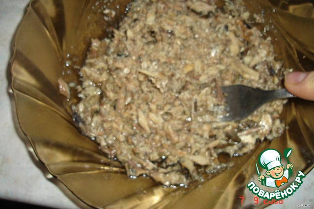 На картошку выложить шпроты и тоже слегка смазать майонезом.