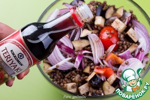 2. Пока варится чечевица, овощи помыть. Пропорции овощей можно брать на свой вкус, можно взять побольше болгарского перца и поменьше лука, можно добавить кабачок. Нарезать баклажаны и перец кубиками (у перца удалить плодоножку и семена), лук нарезать сегментами или полукольцами. Черри можно разрезать пополам, можно запечь целиком. Выложить к овощам чечевицу, добавить масло, перец по вкусу и соус Терияки.