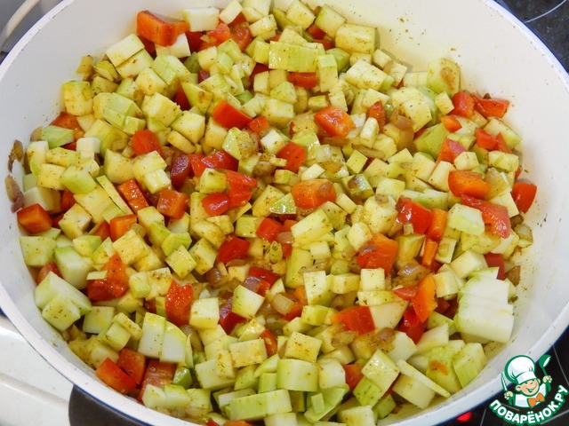 Добавляем нарезанный болгарский перец и кабачок, обжариваем пару минут, помешивая.