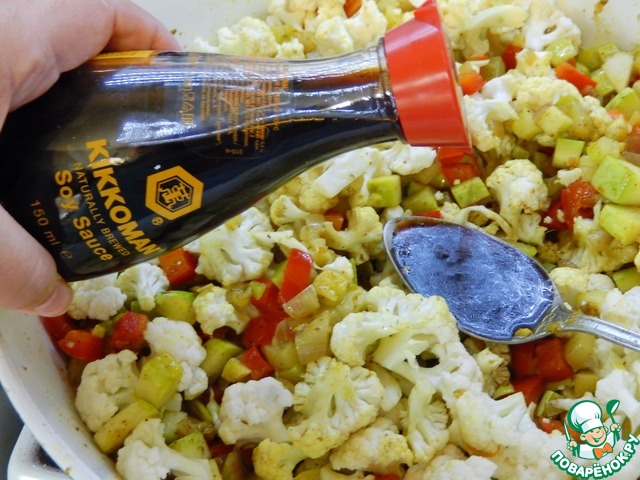 Добавляем нарезанную цветную капусту и соевый соус, перемешиваем. Убавляем огонь, накрываем крышкой, тушим до мягкости капусты.