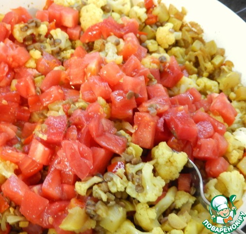Добавляем помидоры и чечевицу, перемешиваем. У меня чечевица не шлифованная, если взять шлифованную, то она станет просто густой основой для соуса. Накрываем крышкой, тушим 15-20 минут. Пробуем на соль, если нужно, добавляем еще соевого соуса и черного перца по вкусу.