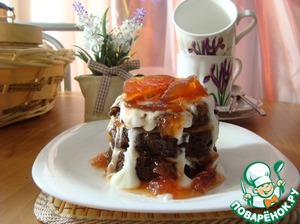 Украшаем бисквит тем, что есть на данный момент в холодильнике. У меня нашлось варенье яблочно-лимонное и йогурт белый. Промазываем каждую часть йогуртом и вареньем.