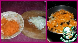 Нарезаем мелко лук и натираем на крупной тёрке морковь => пережариваем 2-3 минуты на сковороде, следим чтобы не пригорело (перемешивать)
