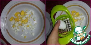 Очищаем отварные яйца вкрутую от скарлупы и режем мелко