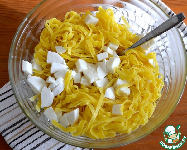 • Тем временем паста должна уже свариться. Слить пасту, выложить в большую миску, положить немного масла, чтобы не слиплась. Добавить к ней кубики моцареллы, сливки и тертый "Пармезан". Осторожно все перемешать...