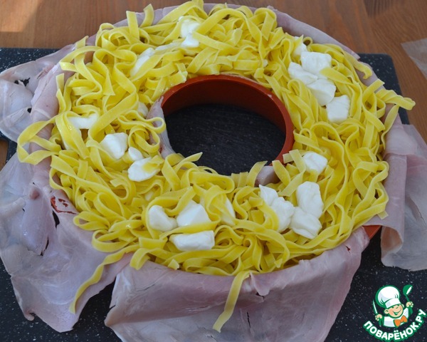 • Поставить запекаться кольцо в духовку на среднем уровне на 15-18 минут. За это время моцарелла должны расплавиться.