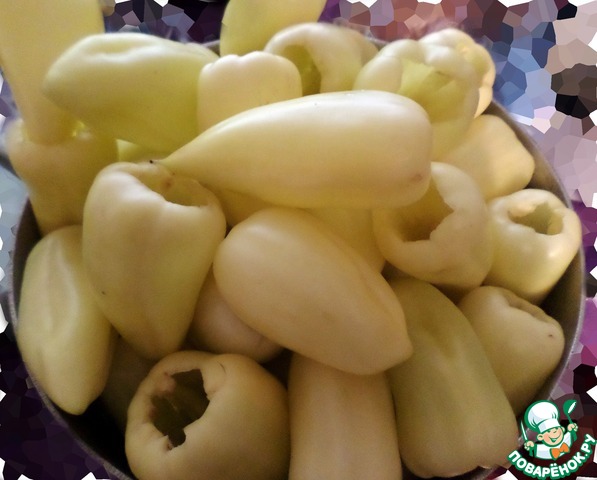 У перца удаляем плодоножки, и стержень с семенами, промываем в воде.