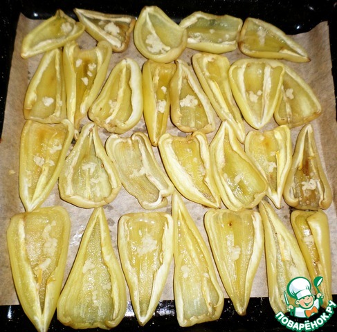 Оставшийся перец я разрезала, уложила на противень, сбрызнула растительным маслом, чесноком и запекла.