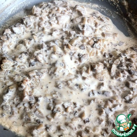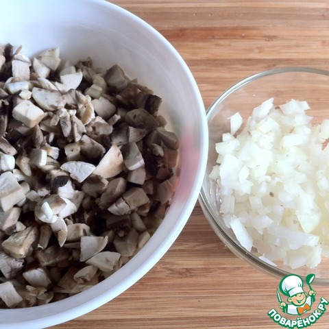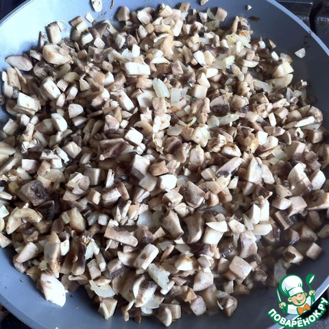 Обжарить на масле лук до прозрачности, добавить грибы и увеличить огонь. Готовим, помешивая, до испарения жидкости.