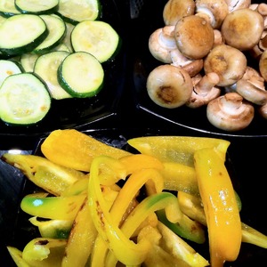Обжарить овощи на подсолнечном масле по отдельности. Цуккини по 1.5 минуты с каждой стороны. Перец, а затем грибы обжаривать, помешивая, 4-5 минут.