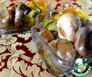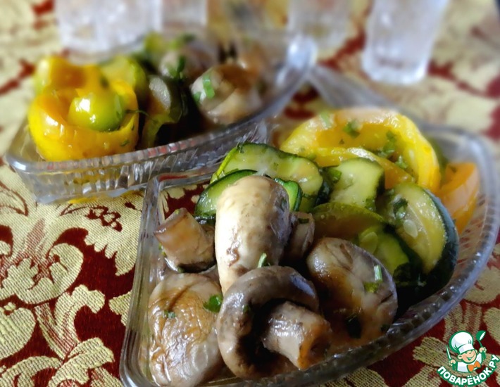 Мне очень нравится этот рецепт. В маринаде нет уксуса, количество и состав специй можно варьировать по своему вкусу, блюдо только выиграет. Готовить очень просто, причем маринуются все овощи одновременно.