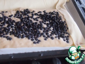 • Добавить в яичную смесь муку с разрыхлителем, осторожно перемешать. Получается густое воздушное тесто. На застеленный бумагой противень положить один лист теста вместе с бумагой, на которой он лежал. На середину пласта выложить половину бисквитного теста и густо посыпать ягодами.
