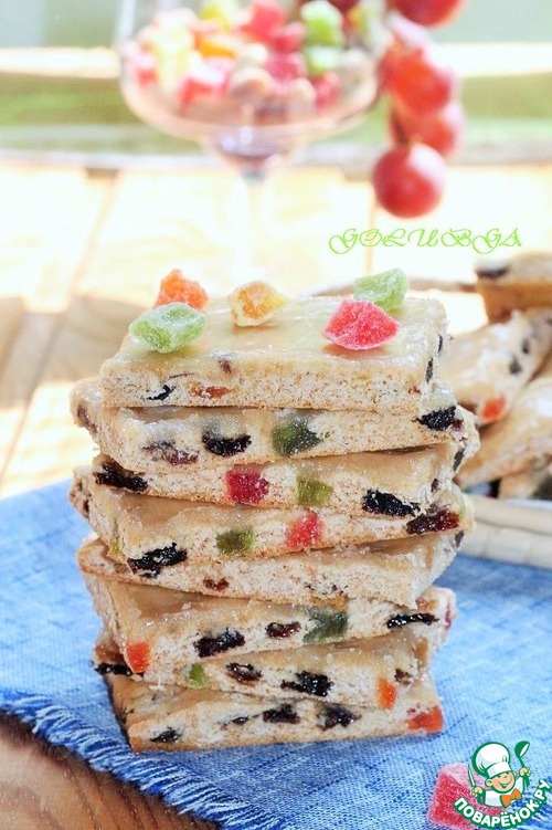 Медовое печенье «Лекерли» - leckerli - переводится как лакомое печенье. Тесто для «Лекерли» готовится из обычной муки, и в него добавляются пряности, а так же орехи, сухофрукты и цукаты. Поверхность готовых «Лекерли» покрывается глазурью из кирша (вишневой водки, если нет импровизируйте - у меня ром). Я добавила еще лимонный сок.