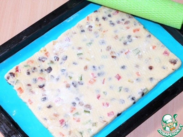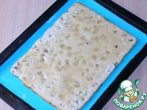 Разложите тесто на поверхность формы для выпекания - это может быть смазанный противень, пекарская бумага или силиконовый коврик. Распределите тесто в пласт толщиной около 1 см сначала руками, а затем выровняйте скалкой.