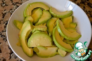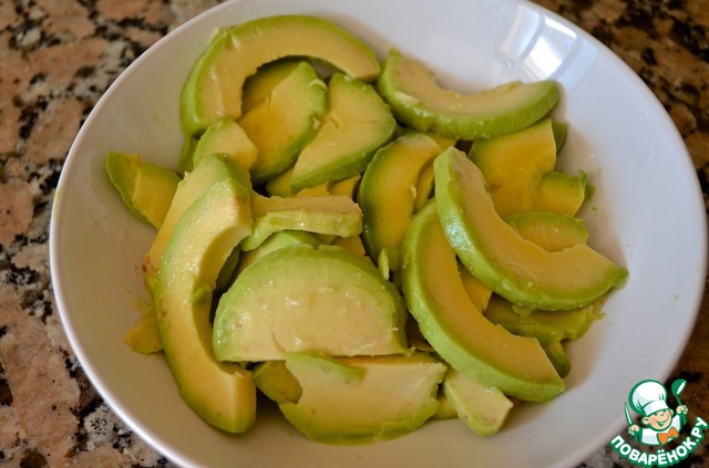• 4. Авокадо очистить, нарезать дольками средней толщины и щедро полить лимонным соком.