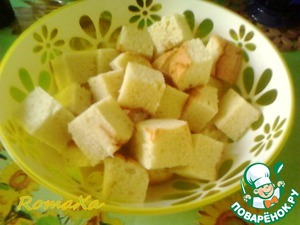 Давленый чеснок смешиваем с оливковым маслом, обваливаем кубики батона и обжариваем