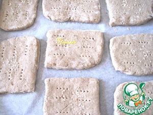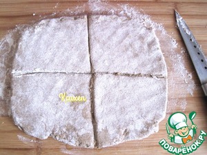 Часть теста выкладываем на присыпанную мукой доску. Пользуясь мукой, формируем квадратный пласт толщиной 1 см и разрезаем его на части желаемого размера.