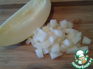 Дыню разрезать пополам и очистить от семян. Для смузи нам понадобится 1/4 часть дыни, очистим ее от кожуры и нарезаем небольшими кусочками.